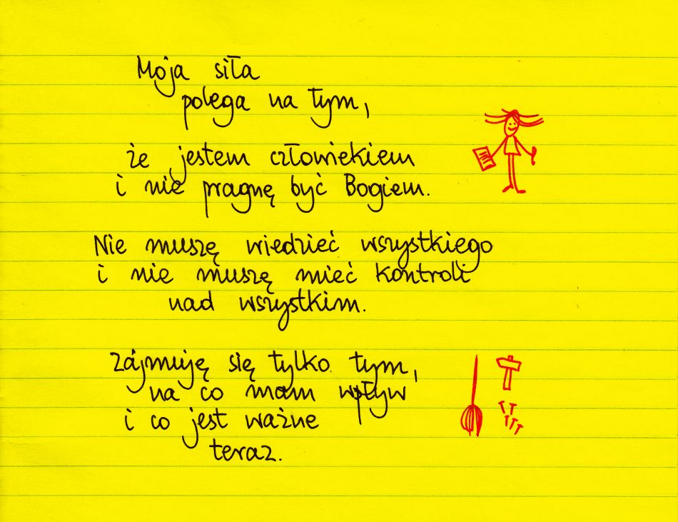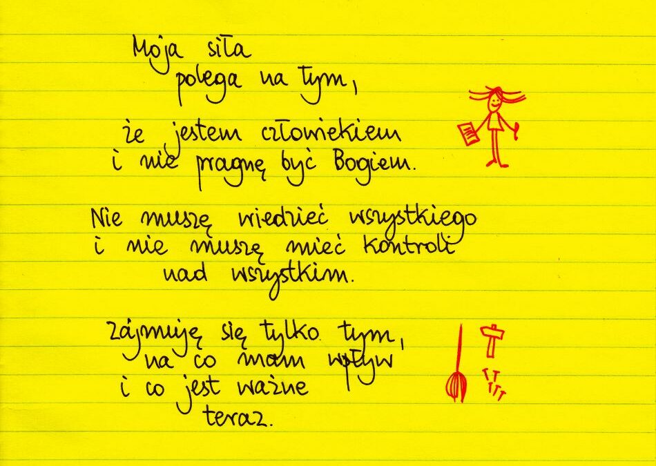 Żółte kartki Moja siła polega na tym czwartek, 31.10.2024 Moja siła polega na tym, że jestem człowiekiem i nie pragnę być Bogiem. Nie muszę wiedzieć wszystkiego i nie muszę mieć kontroli nad wszystkim. Zajmuję się tylko tym, na co mam wpływ i co jest ważne teraz ❤ Udostępnij na Facebooku