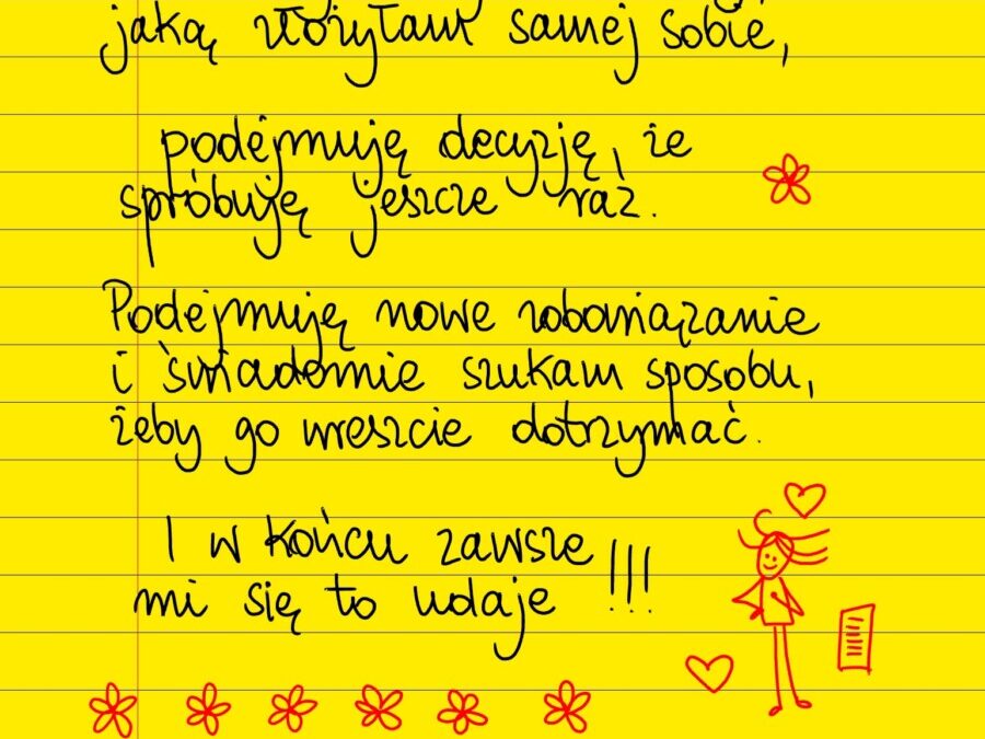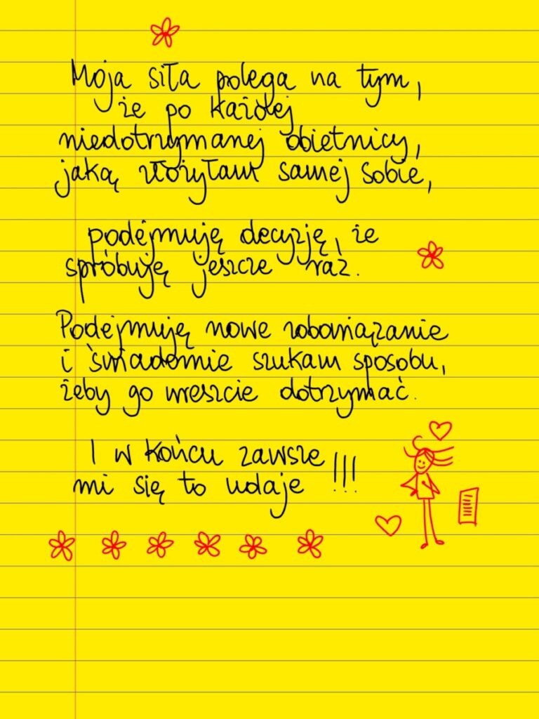 Moja siła polega na tym, że po każdej niedotrzymanej obietnicy, jaką zlożyłam sobie, podejmuję decyzję, że spróbuję jeszcze raz. Podejmuję nowe zobowiązanie i świadomie szukam sposobu,. żeby go wreszcie dotrzymać. I w końcu zawsze mi się to udaje! #żółtakartka