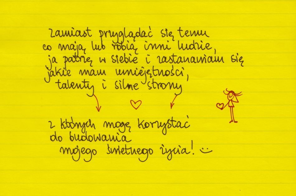 Żółte kartki Moje silne strony poniedziałek, 06.12.2021 Zamiast przyglądać się temu co mają lub robią inni ludzie, ja patrzę w siebie i zastanawiam się jakie mam umiejętności, talenty i silne strony, z których mogę korzystać do budowania mojego świetnego życia! 🙂 #żółtakartka Udostępnij na Facebooku