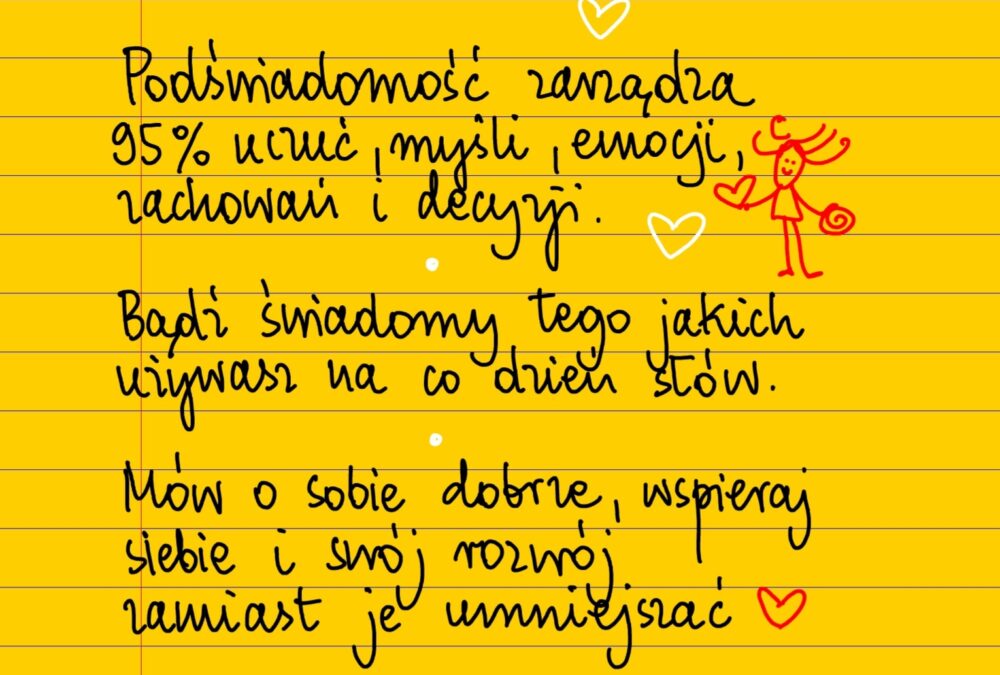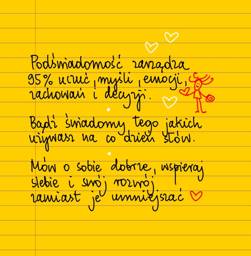 Żółte kartki Mów o sobie dobrze wtorek, 02.04.2024 Podświadomość zarządza 95% uczuć, myśli, emocji, zachowań i decyzji. Bądź świadomy tego jakich używasz na co dzień słów i co o sobie mówisz. Mów o sobie dobrze, wspieraj siebie i swój rozwój zamiast je umniejszać ❤ #żółtakartka #BeataPawlikowska Udostępnij na Facebooku