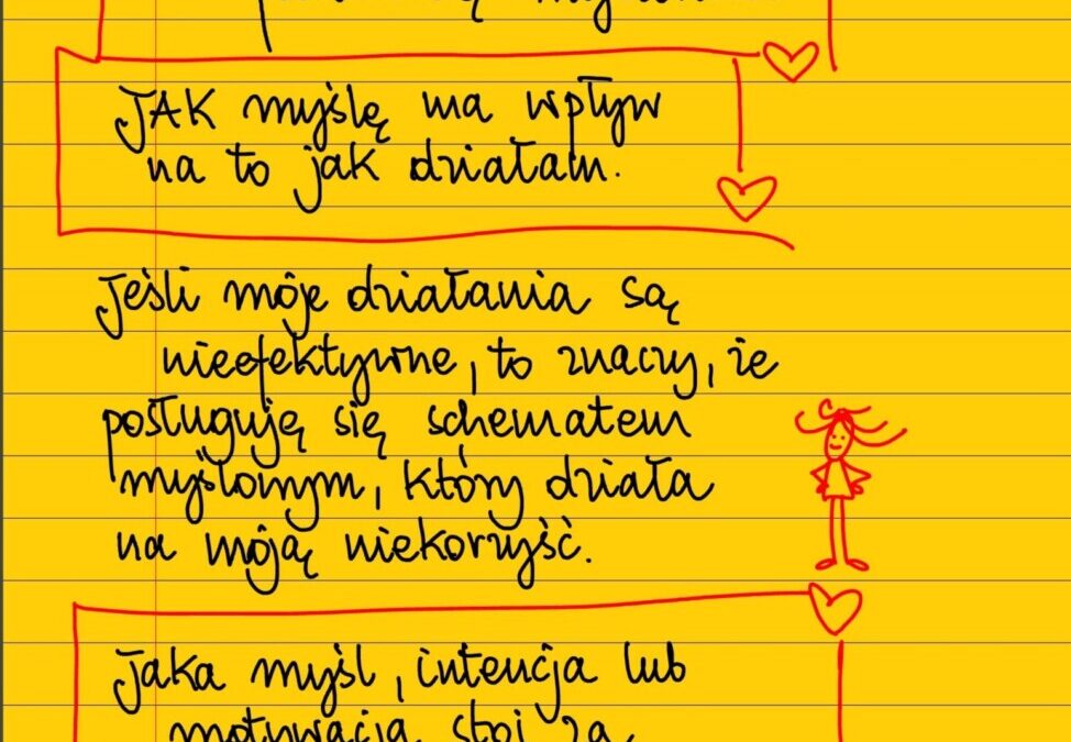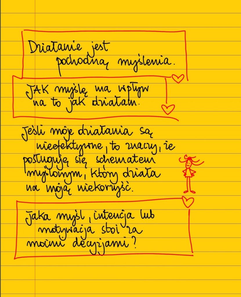 Działanie jest pochodną myślenia. JAK myślę ma wpływ na to jak działam. Jeśli moje działania są nieefektywne, to znaczy, że posługuję się schematem myślowym, który działa na moją niekorzyść. Jaka ukryta myśl, intencja lub motywacja stoi za moimi decyzjami?