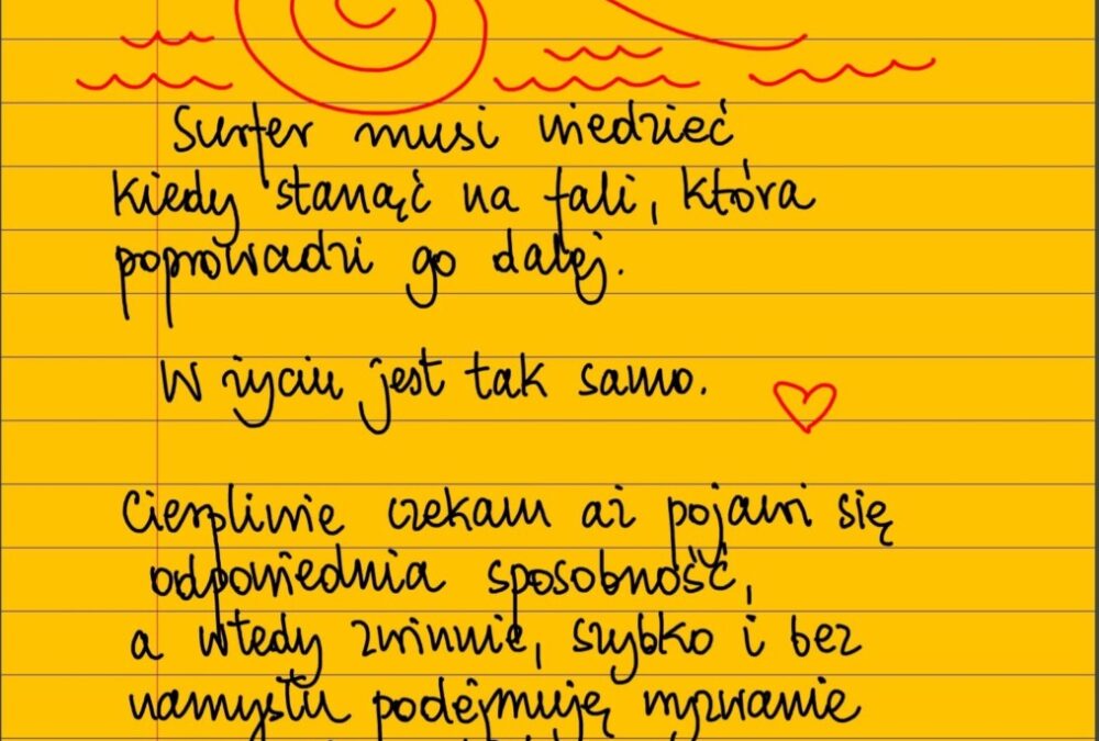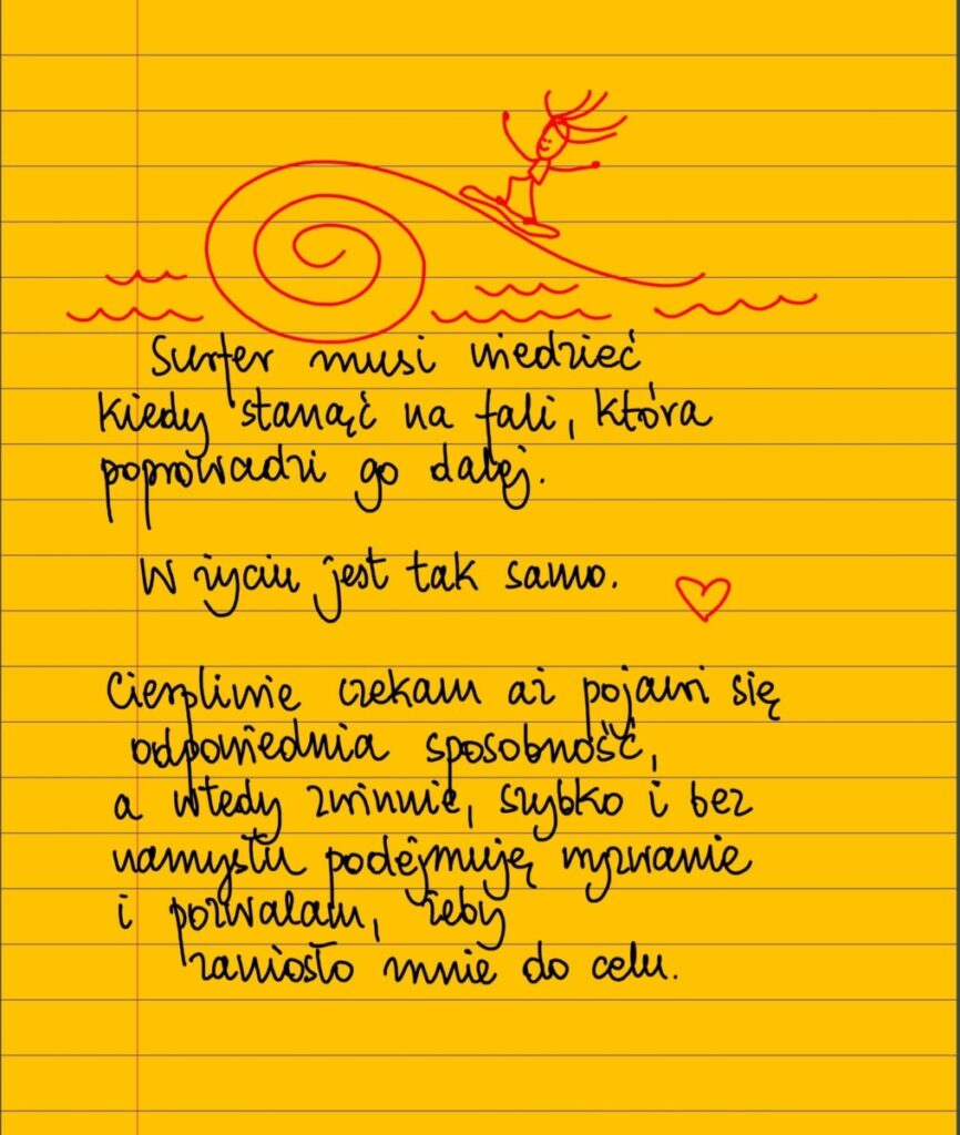 Surfer musi wiedzieć kiedy stanąć na fali, która poprowadzi go dalej. W życiu jest tak samo. Cierpliwie czekam aż pojawi się odpowiednia sposobność, a wtedy zwinnie, szybko i bez namysłu podejmuje wyzwanie i pozwalam, żeby zaniosło mnie do celu.