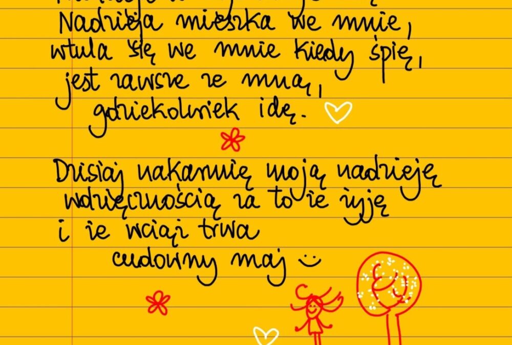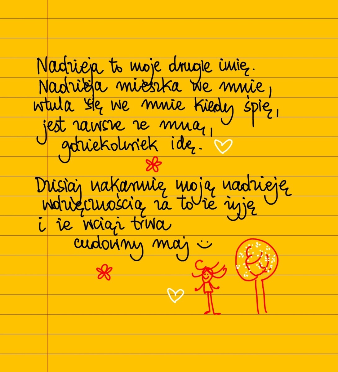 Nadzieja to moje drugie imię. Nadzieja mieszka we mnie, wtula się we mnie kiedy śpię, jest zawsze ze mną gdziekolwiek idę. Dzisiaj nakarmię moją nadzieję wdzięcznością za to, że żyję i że wciąz trwa cudowny maj. #żółtakartka.