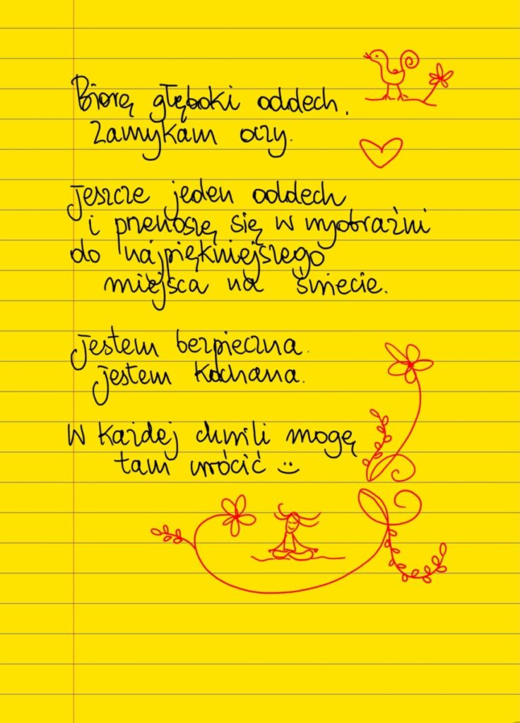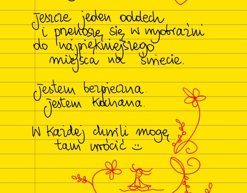 Żółte kartki Najpiękniejsze miejsce wtorek, 01.03.2022 Biorę głęboki oddech. Zamykam oczy. Jeszcze jeden oddech i przenoszę się w wyobraźni do najpiękniejszego miejsca na świecie. Jestem bezpieczna. Jestem kochana. W każdej chwili mogę tam wrócić 🙂 #żółtakartka Udostępnij na Facebooku