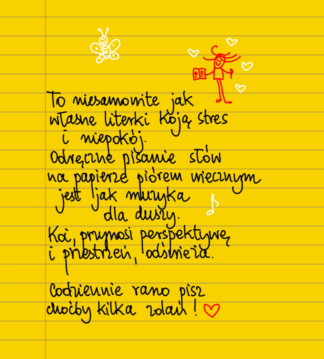 To niesamowite jak własne literki koją niepokój i stres. Odręczne pisanie słów na papierze piórem wiecznym jest jak muzyka dla duszy. Koi, przynosi perspektywę, przestrzeń i równowagę, odświeża i odnawia. Codziennie rano pisz choćby kilka zdań! #żółtakartka