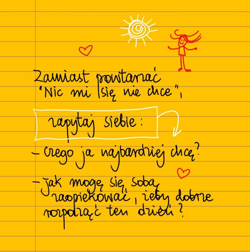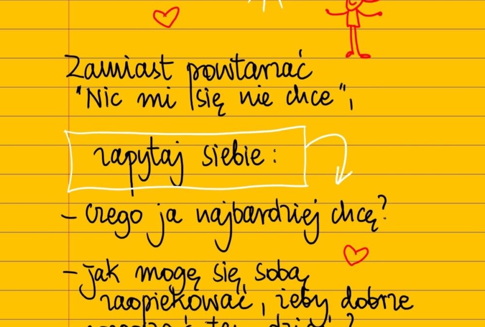 Żółte kartki Nic mi się nie chce wtorek, 21.02.2023 Zamiast powtarzać „nic mi się nie chce” zapytaj siebie: – Czego ja najbardziej chcę? Jak mogę się sobą zaopiekować, żeby dobrze rozpocząć ten dzień? #żółtakartka Udostępnij na Facebooku