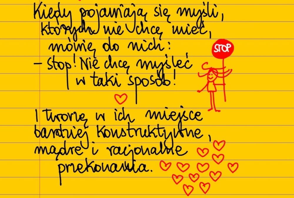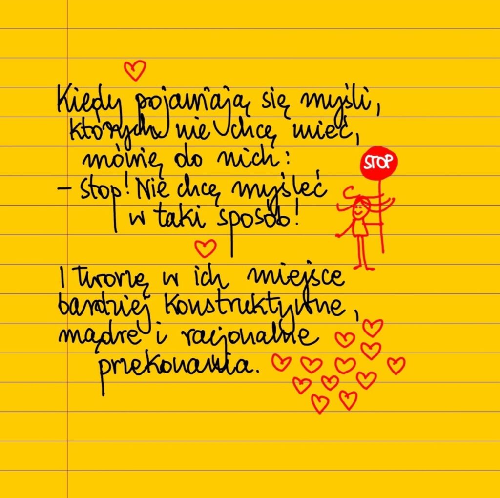 Żółte kartki Nie chcę myśleć w taki sposób! czwartek, 12.01.2023 Kiedy pojawiają się myśli, których nie chcę mieć, mówię do nich: Stop. Nie chcę myśleć w taki sposób! I tworzę w ich miejsce bardziej konstruktywne, mądre i racjonalne przekonania. #żółtakartka Udostępnij na Facebooku