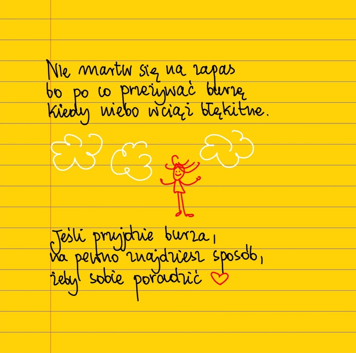 Żółte kartki Nie martw się na zapas środa, 26.05.2021 Nie martw się na zapas, bo po co przeżywać burzę kiedy niebo wciąż błękitne. Jeśli przyjdzie burza, na pewno znajdziesz sposób, żeby sobie poradzić. #żółtakartka Udostępnij na Facebooku