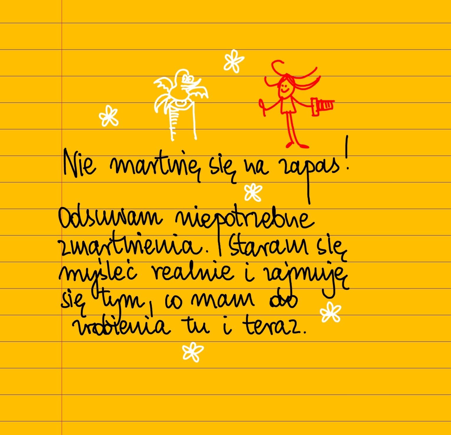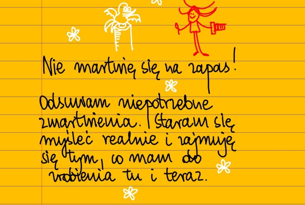 Żółte kartki Nie martwię się na zapas! czwartek, 11.05.2023 Nie martwię się na zapas! ❤ Odsuwam niepotrzebne zmartwienia. Staram się myśleć realnie i zajmuję się tym, co mam do zrobienia tu i teraz ❤ #żółtakartka Udostępnij na Facebooku