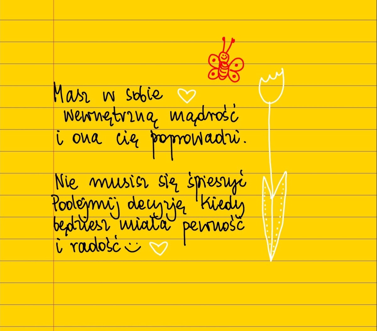 Żółte kartki Nie musisz się śpieszyć poniedziałek, 07.06.2021 Masz w sobie wewnętrzną mądrość i ona cię poprowadzi. Nie musisz się śpieszyć. Podejmij decyzję kiedy będziesz miała pewność i radość. #żółtakartka Udostępnij na Facebooku