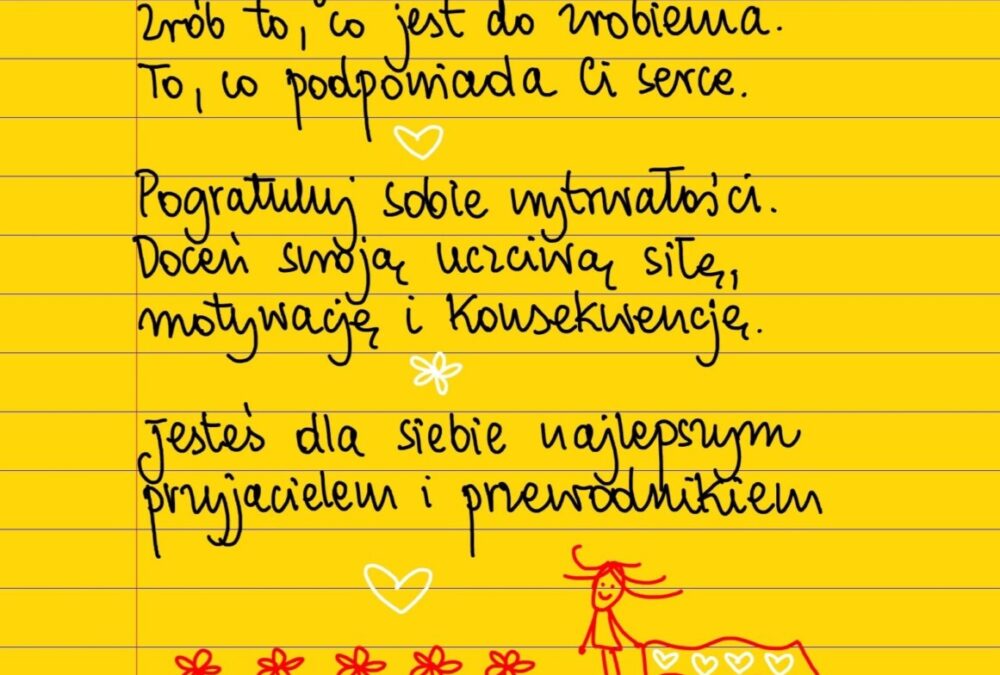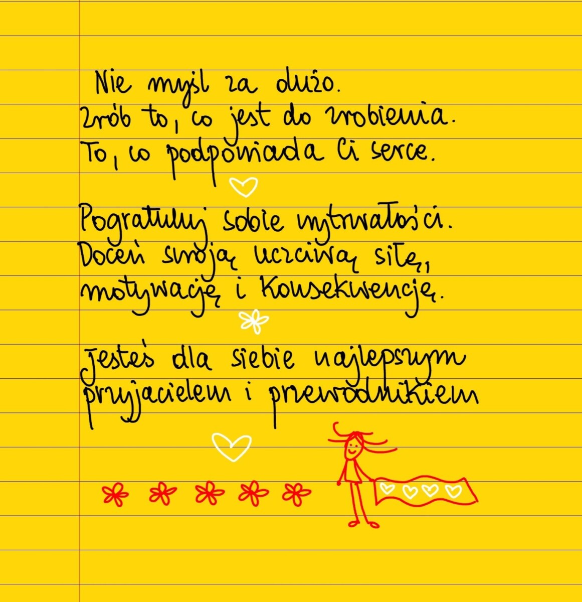 Nie myśl za dużo. Zrób to co jest do zrobienia. To co podpowiada ci serce. Pogratuluj sobie wytrwałości. Doceń swoją uczciwą siłę  motywację i konsekwencję.  Jesteś dla siebie najlepszym przyjacielem i przewodnikiem. #żółtakartka
