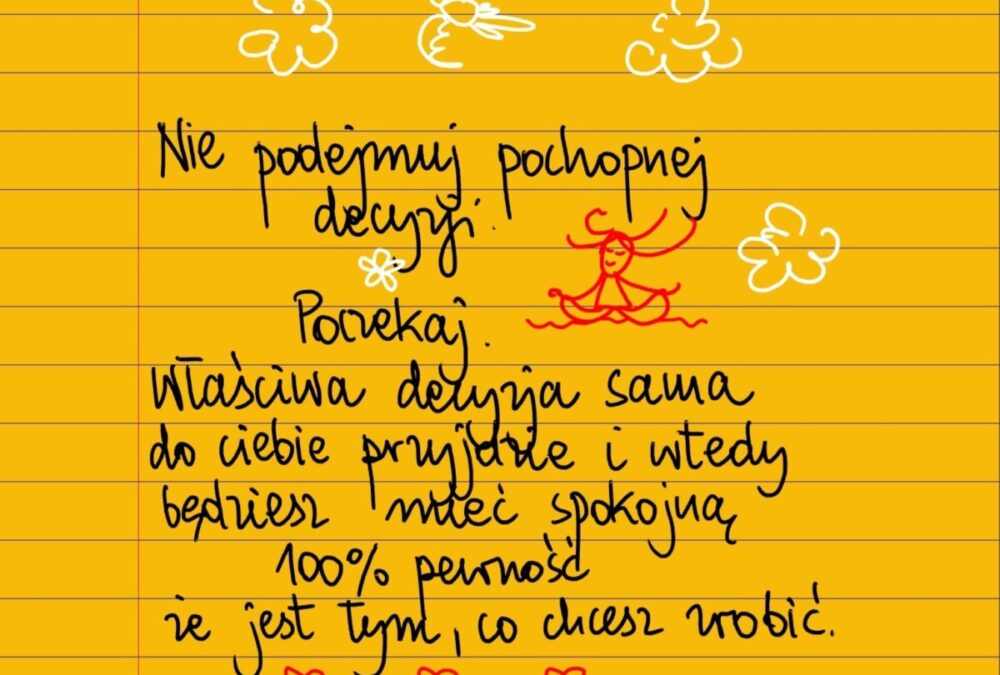 Nie podejmuj pochopnej decyzji. Poczekaj. Właściwa decyzja sama do ciebie przyjdzie i wtedy będziesz miała spokojną, 100% pewność, że jest tym, co chcesz zrobić. #żółtakartka