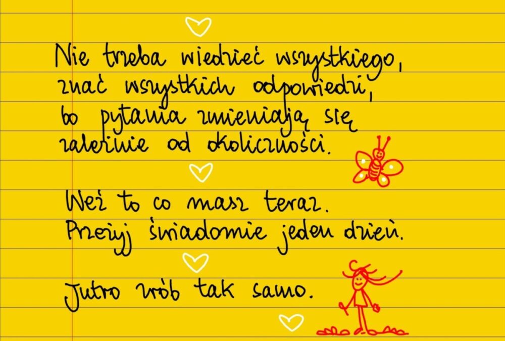 Nie trzeba wiedzieć wszystkiego, znać wszystkich odpowiedzi, bo pytania zmieniają się zależnie od okoliczności. Weź to co masz teraz. Przeżyj świadomie jeden dzień. Jutro zrób tak samo. #żółtakartka