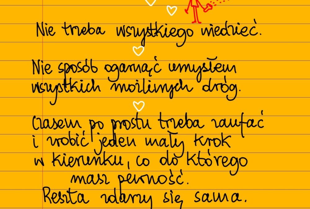 Nie trzeba wszystkiego wiedzieć. Nie sposób ogarnąć umysłem wszystkich możliwych scenariuszy, dróg i rozwiązań. Czasem po prostu trzeba zaufać i zrobić jeden mały krok w kierunku, co do którego masz pewność. Reszta zdarzy się sama ❤ #żółtakartka #beatapawlikowska