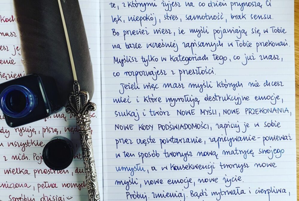 Jeżeli więc masz myśli, których nie chcesz mieć i które wywołują destrukcyjne emocje, szukaj i twórz NOWE MYŚLI, NOWE PRZEKONANIA, NOWE KODY PODŚWIADOMOŚCI, zapisuj je w sobie przez częste powtarzanie, zapisywanie – ponieważ w ten sposób tworzysz nową matrycę swojego umysłu, a w konsekwencji tworzysz nowe myśli, nowe emocje, nowe życie.