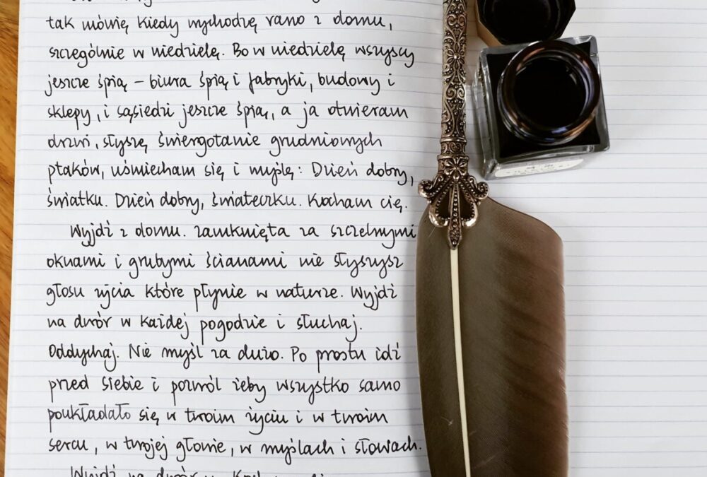 Wyjdź z domu. Zamknięta za szczelnymi oknami i grubymi ścianami nie słyszysz głosu życia, które płynie w naturze. Wyjdź na dwór w każdej pogodzie i słuchaj. Oddychaj. Nie myśl za dużo. Po prostu idź przed siebie i pozwól, żeby wszystko samo poukładało się w twoim życiu i w twoim sercu, w twojej głowie, w myślach i słowach.