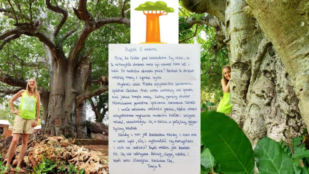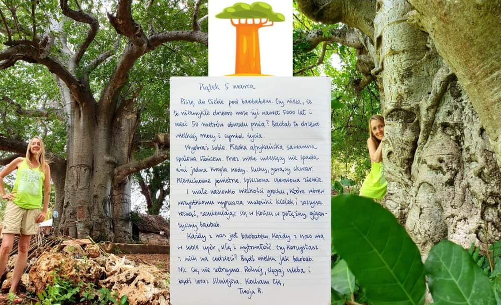 Piszę do Ciebie pod baobabem. Czy wiesz, że to niezwykłe drzewo może żyć nawet 5000 lat i mieć 50 metrów obwodu pnia? Baobab to drzewo wielkiej mocy i symbol życia.