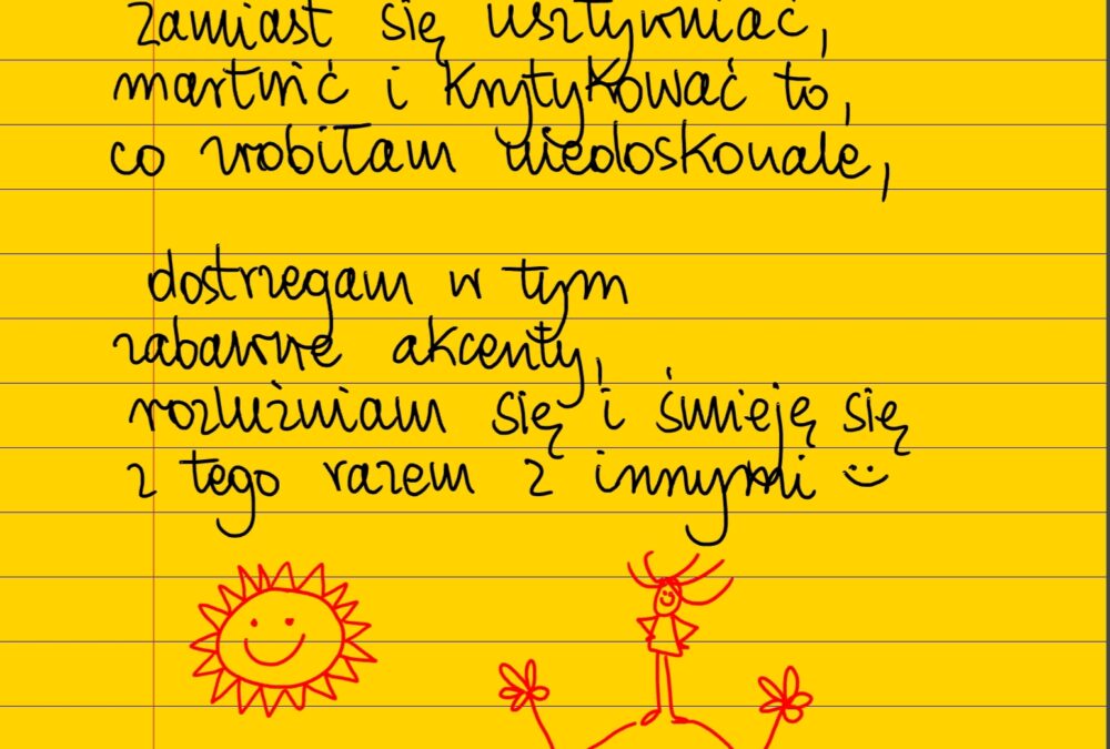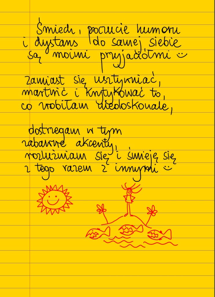 Żółte kartki Poczucie humoru piątek, 24.11.2023 Śmiech, poczucie humoru i dystans do samego siebie są moimi przyjaciółmi 😊 Zamiast się usztywniać, martwić i krytykować to, co zrobiłam niedoskonale, dostrzegam w tym zabawne akcenty, rozluźniam się i śmieję się z tego razem z innymi 😊 #żółtakartka Udostępnij na Facebooku