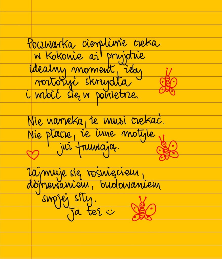 Poczwarka cierpliwie czeka w kokonie aż przyjdzie idealny moment, żeby rozłożyć skrzydła i wzbić się w powietrze. Nie narzeka, że musi czekac. Nie płacze, że inne motyle już fruwają. Zajmuje się rośnięciem, dojrzewaniem, budowaniem swojej siły. Ja też ❤ #żółtakartka
