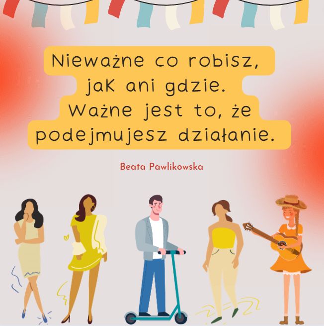 Nieważne jak. Wszyscy zmierzali naprzód. Każdy zbliżał się do zrealizowania swojego życiowego celu, nawet jeśli w tamtym momencie nie zdawali sobie z tego sprawy. Najważniejsze jest to, że podjęli działanie. Cicha dziewczyna z gitarą być może szła na mistrzowski egzamin i wkrótce wszyscy będą ją podziwiać. Nieważne co robisz, jak ani gdzie. Ważne jest to, że podejmujesz działanie. Ono doprowadzi cię do celu.