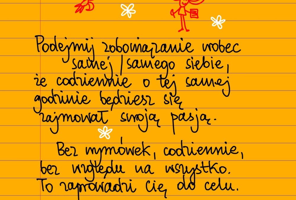 Podejmij zobowiązanie wobec samej/samego siebie, że codziennie o tej samej godzinie będziesz zajmował się swoją pasją. Bez wymówek, codziennie, bez względu na wszystko. To zaprowadzi cię do celu ❤ #żółtakartka