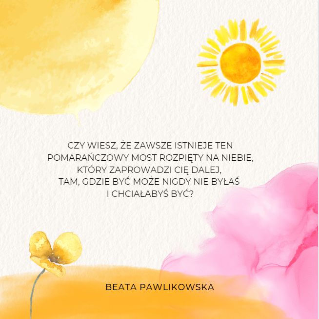 Czy wiesz, że zawsze istnieje ten pomarańczowy most rozpięty na niebie, który zaprowadzi Cię dalej, tam, gdzie być może nigdy nie byłaś i chciałabyś być?