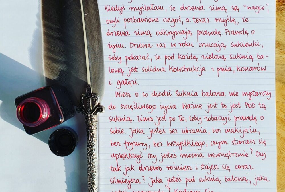 Wiesz o co chodzi. Suknia balowa nie wystarczy do szczęśliwego życia. Ważne jest to, co jest POD tą suknia. Zima jest po to, żeby zobaczyć prawdę o sobie. Jaka jesteś bez ubrania, bez makijażu, bez fryzury, bez wszystkiego, czym starasz się upiększyć. Czy jesteś mocna wewnętrznie? Czy tak jak drzewo rośniesz i stajesz się coraz silniejsza? Jaka jesteś pod suknią balową, jaka jesteś naprawdę? Kocham Cię,