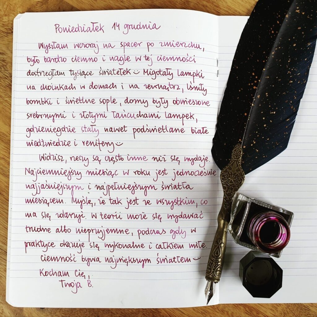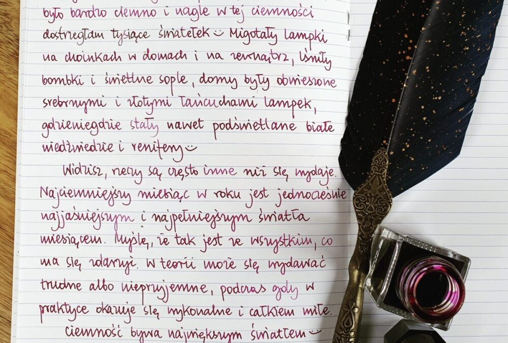 Wyszłam wczoraj na spacer po zmierzchu, było bardzo ciemno i nagle w tej ciemności dostrzegłam tysiące światełek 😊 Migotały lampki na choinkach w domach i na zewnątrz, lśniły bombki i świetlne sople, domy były obwieszone srebrnymi i złotymi łańcuchami lampek, gdzieniegdzie stały nawet podświetlane białe niedźwiedzie i renifery 😊