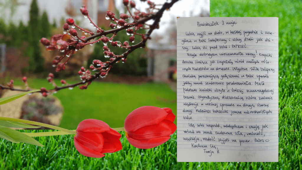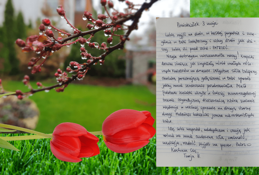 Nagle dostrzegam niesamowite rzeczy! Kropelki deszczu lśniące jak kryształy wśród małych różowych kwiatków na drzewie. Wilgotne żółte tulipany. Choinkę poruszającą gałęziami w taki sposób, jakby mnie serdecznie pozdrawiała. Małe fioletowe kwiatki ukryte w świeżej szmaragdowej trawie. Gigantyczną dżdżownicę, która zwinnie wędruje w ważnej sprawie na drugą stronę drogi. Maleńkie bukieciki jeszcze nierozkwitłych bzów.