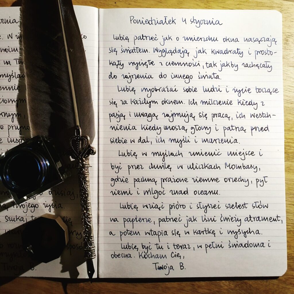 Lubię wziąć pióro i słyszeć szelest słów na papierze, patrzeć jak lśni świeży atrament, a potem wtapia się w kartkę i wysycha.