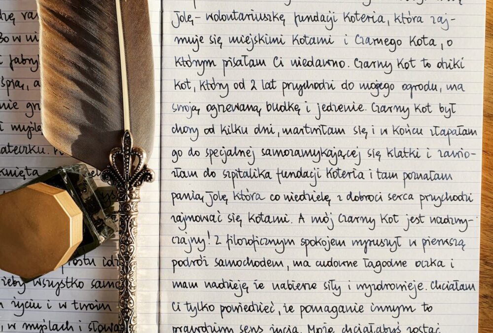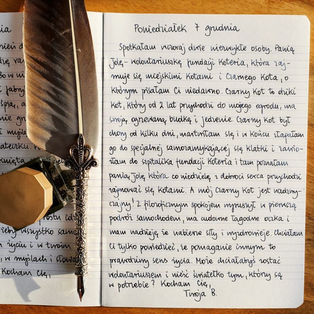 Spotkałam wczoraj dwie niezwykłe osoby. Panią Jolę – wolontariuszkę fundacji Koteria, która zajmuje się miejskimi kotami i Czarnego Kota, o którym pisałam Ci niedawno. Czarny Kot to dziki kot, który od dwóch lat przychodzi do mojego ogrodu, ma swoją ogrzewaną budkę i jedzenie. Czarny Kot był chory od kilku dni, martwiłam się i w końcu złapałam go do samozamykającej się klatki i zawiozłam do szpitalika fundacji Koteria i tam poznałam panią Jolę, która co niedzielę z dobroci serca przychodzi zajmować się kotami.