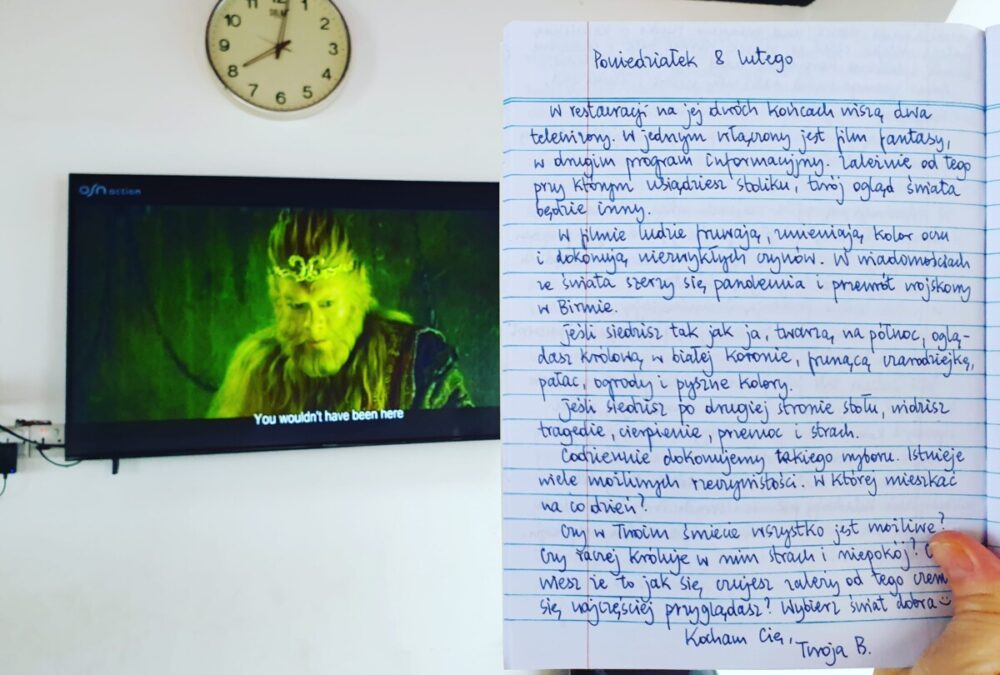 W restauracji na jej dwóch końcach wiszą dwa telewizory. W jednym włączony jest film fantasy, w drugim program informacyjny. Zależnie od tego przy którym usiądziesz stoliku, Twój oglad świata będzie inny.
