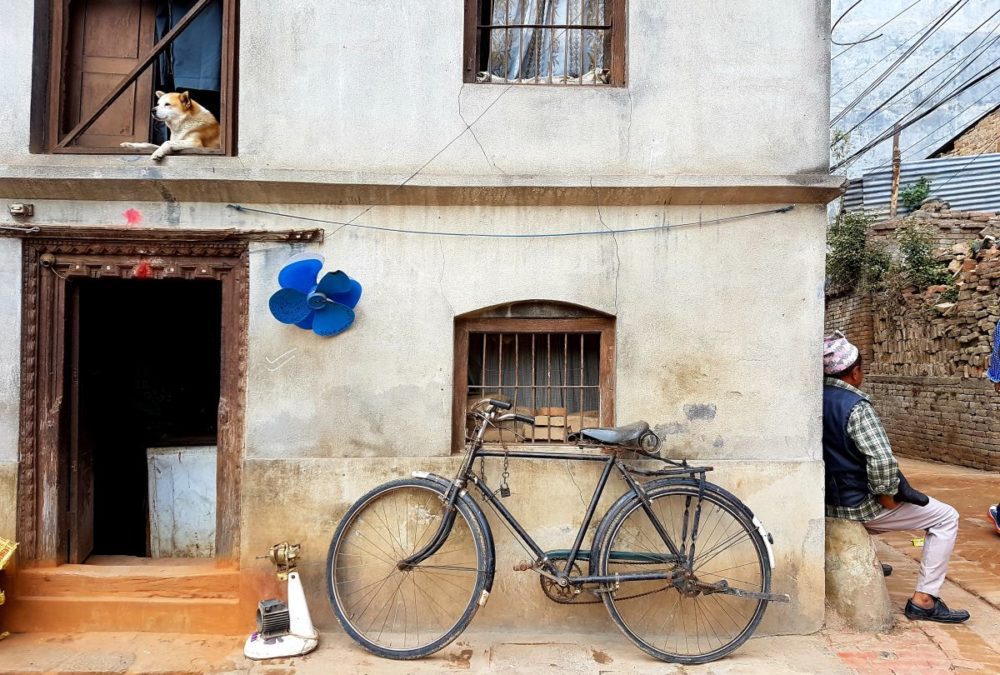 Nepal. Zaczyna się dzień. Każdy ma swoje miejsce i czas. Rower oparty o ścianę, pies patrzący na zachód i mężczyzna skierowany na wschód. Niebieska głowa wentylatora przypięta jak chaber do ściany. Żółty pył ziemi, kable układające swój własny porządek świata i dwa jasne znaki przy drzwiach. Wszystko będzie dobrze.
