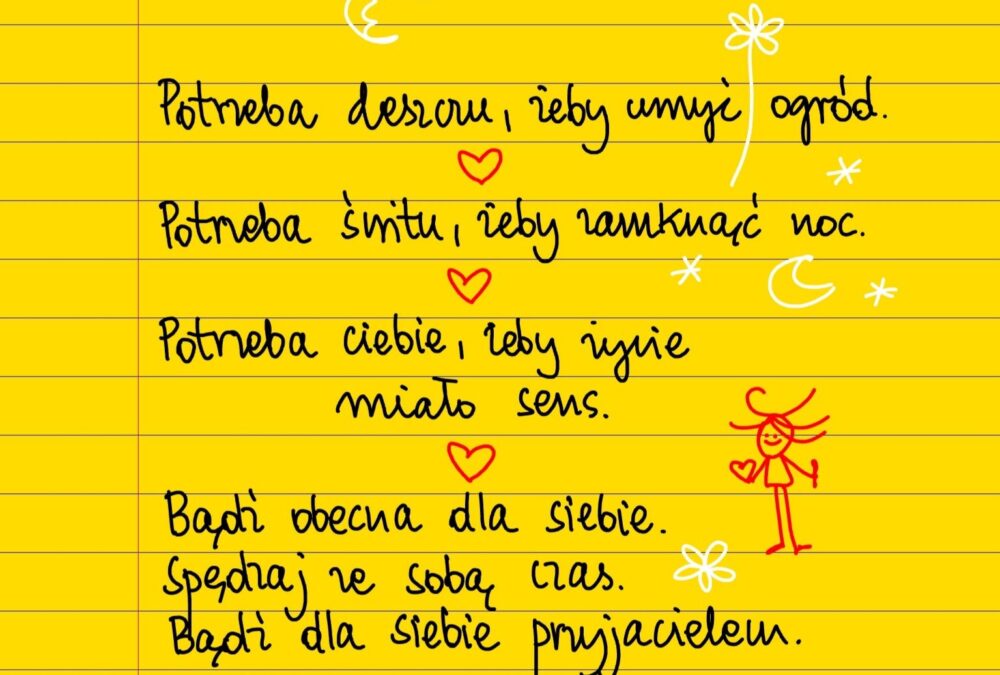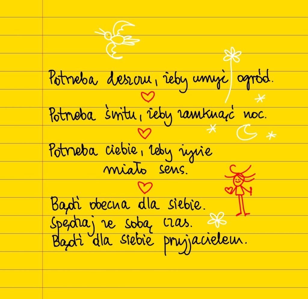 Żółte kartki Potrzeba Ciebie piątek, 08.12.2023 Potrzeba deszczu, żeby umyć ogród. Potrzeba świtu, żeby zamknąć noc. Potrzeba Ciebie, żeby życie miało sens. Bądź obecna/obecny dla siebie. Spędzaj ze sobą czas. Bądź dla siebie przyjacielem ❤ #żółtakartka Udostępnij na Facebooku