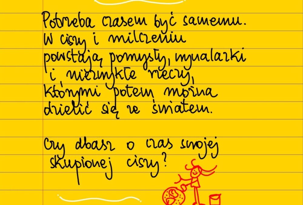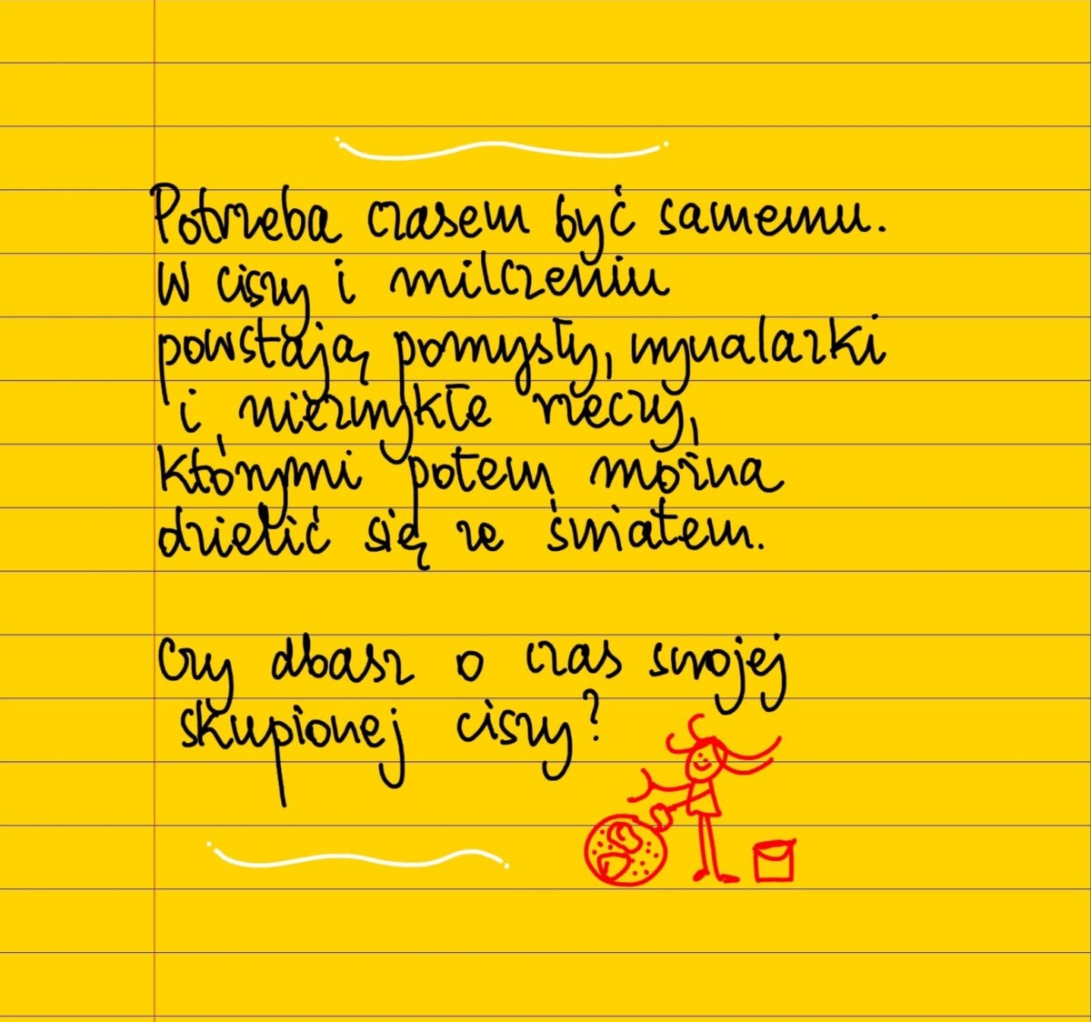 Potrzeba czasem być samemu. W ciszy i milczeniu powstają pomysły, wynalazki i niezwykłe rzeczy, z którymi potem można dzielić się ze światem. Czy dbasz o czas swojej skupionej ciszy? #żółtakartka