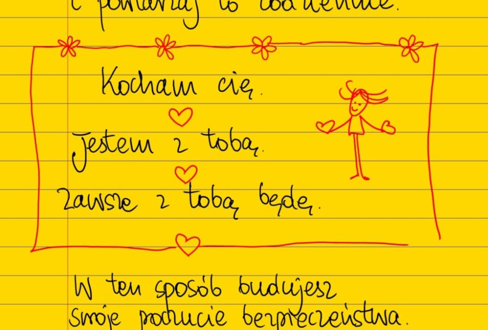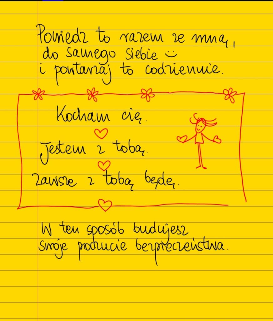 Powiedz to razem ze mną, do samego siebie i powtarzaj to codziennie: – Kocham cię. Jestem z tobą. Zawsze z tobą będę. – W ten sposób budujesz swoje poczucie bezpieczeństwa. #żółtakartka