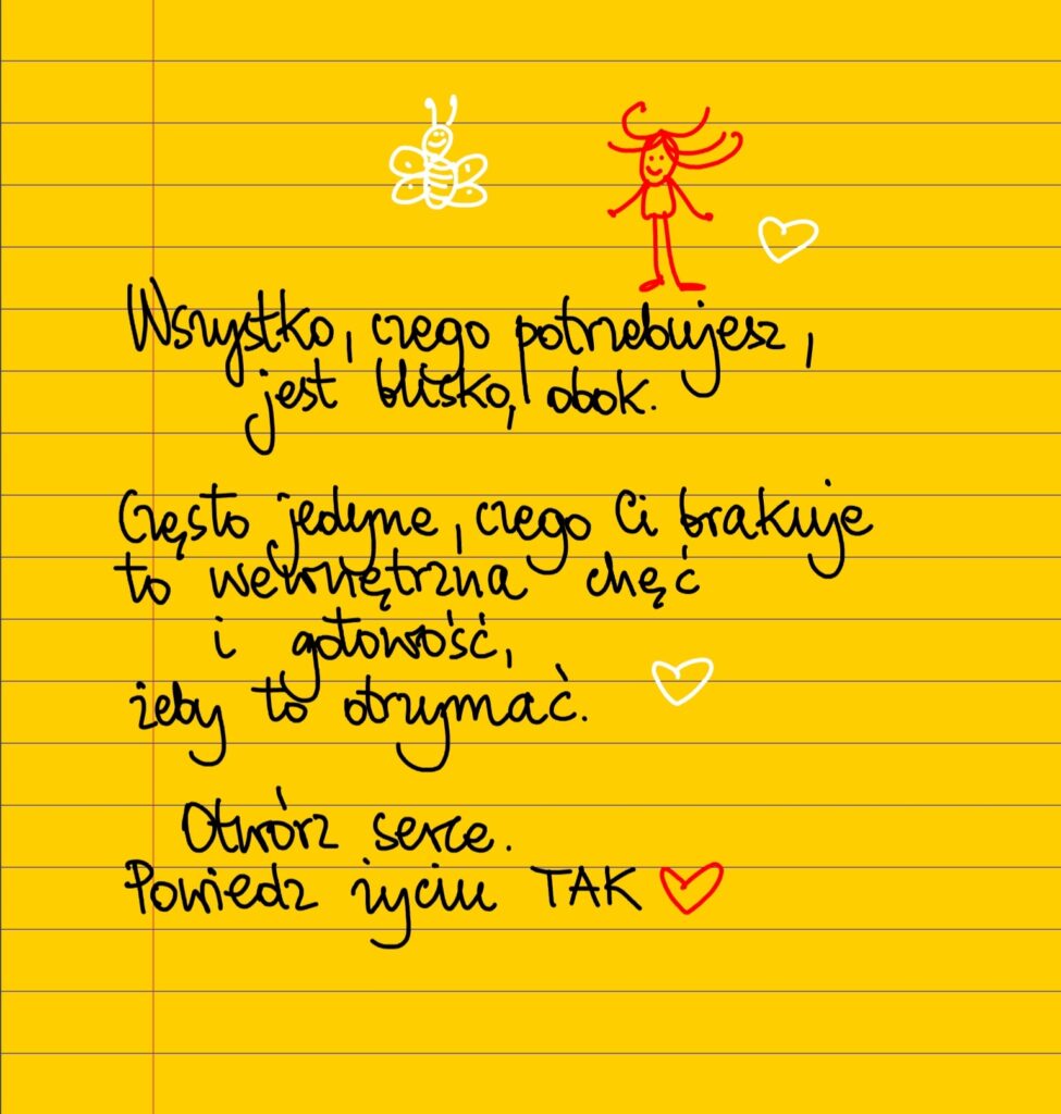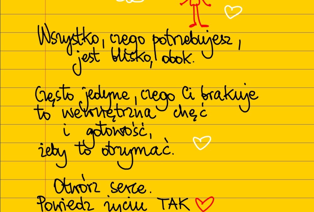 Żółte kartki Powiedz życiu „Tak” poniedziałek, 02.10.2023 Wszystko, czego potrzebujesz, jest blisko, tuż obok. Często jedyne, czego ci brakuje, to wewnętrzna chęć i gotowość, żeby to otrzymać. Otwórz serce. Powiedz życiu „Tak” ❤Uśmiechnij się ❤ Udostępnij na Facebooku