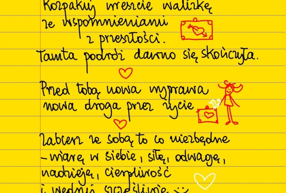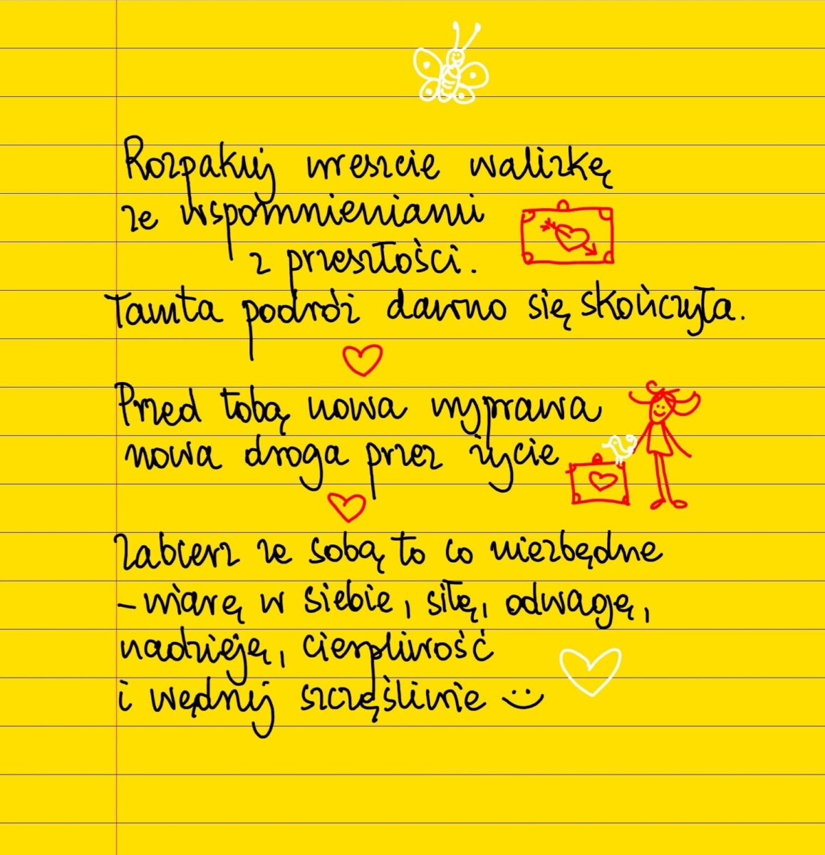 Rozpakuj wreszcie walizkę ze wspomnieniami z przeszłości. Tamta podróż dawno się skończyła. Przed tobą nowa wyprawa, nowa droga przez życie. Zabierz ze sobą to co niezbędne – wiarę w siebie, siłę, odwagę, nadzieję, cierpliwość – i wędruj szczęśliwie 😀❤ #żółtakartka