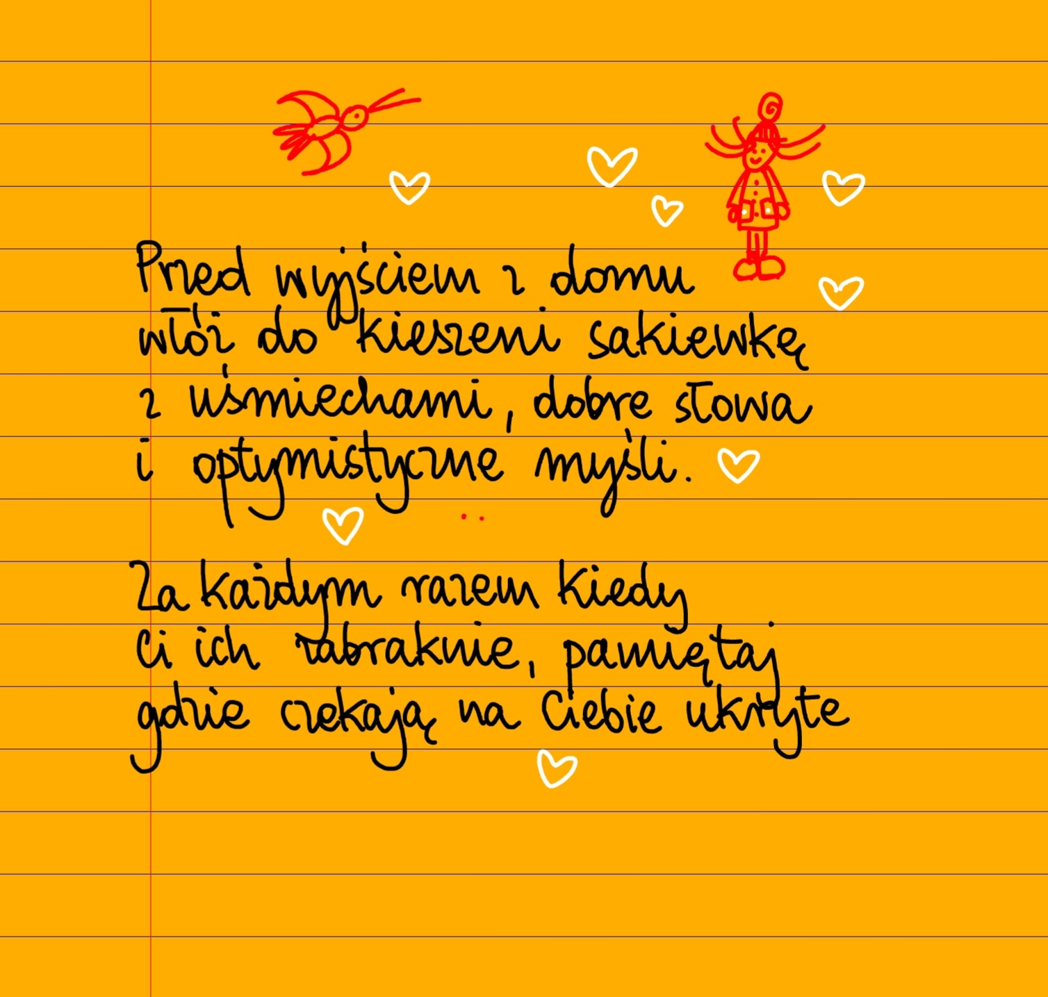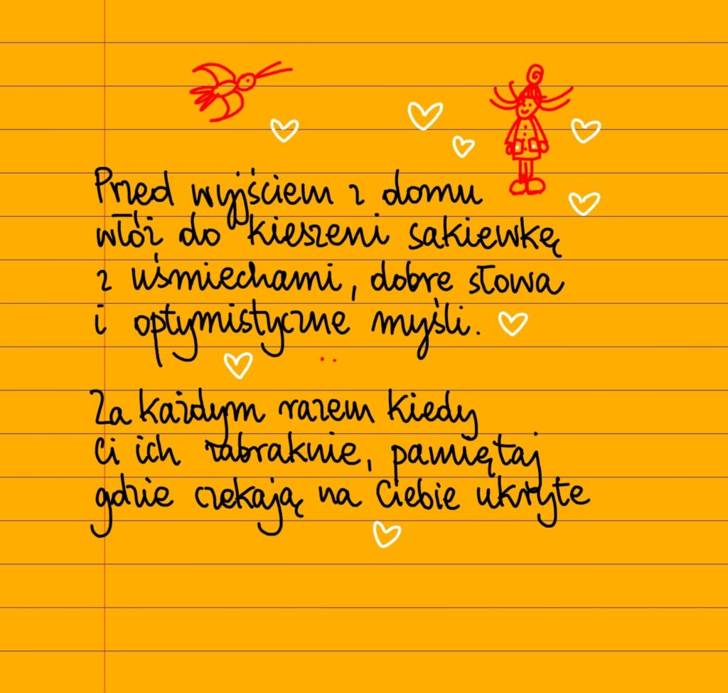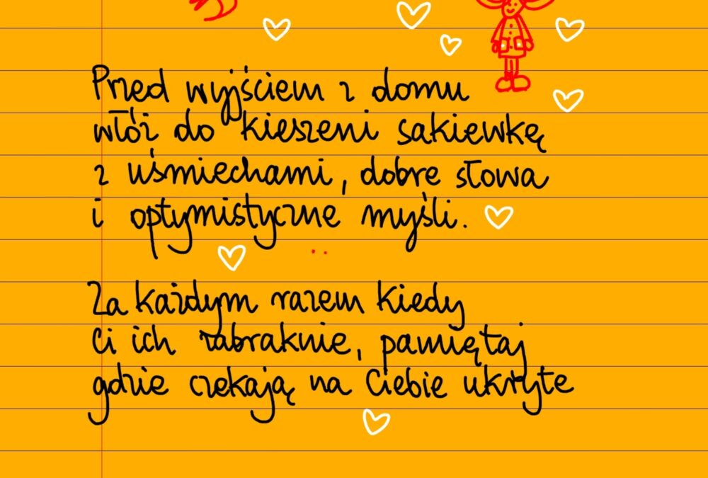Bez kategorii Przed wyjściem z domu wtorek, 28.01.2025 Przed wyjściem z domu włóż do kieszeni sakiewkę z uśmiechami, dobre słowa i optymistyczne myśli. Za każdym razem kiedy ci ich zabraknie, pamiętaj gdzie czekają na ciebie ukryte ❤ Udostępnij na Facebooku