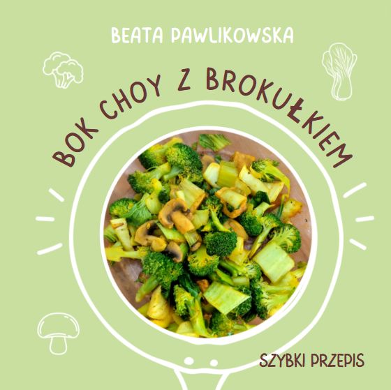 To mój pyszny obiad – bok choy z brokułkiem, pieczarkami i czosnkiem. Bok choy to inaczej chińska kapusta. Łatwo ją znaleźć w sklepach, jest trochę podobna do sałaty. Liście są białe i grube na dole, zielone na górze. To szybkie danie zrobisz z kilku składników w dziesięć minut.