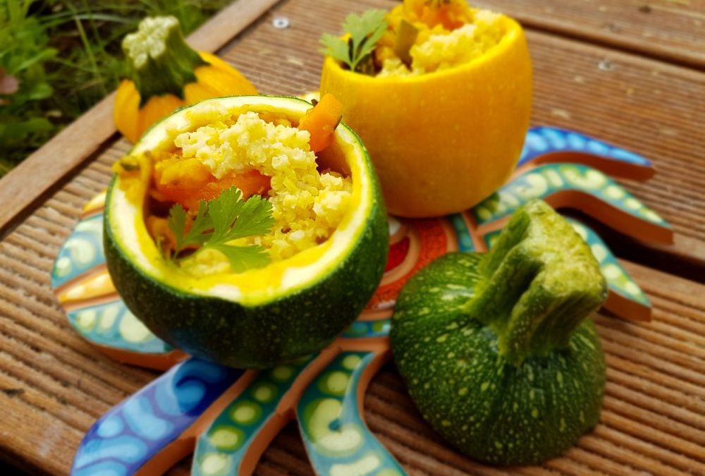 Napełnij kaszą z warzywami wydrążone cukinie, podawaj ze świeżą bazylią.