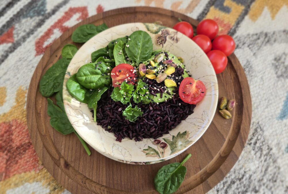 Czarny ryż z awokado i szpinakiem