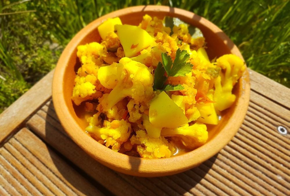 (Z) Dodaj dokładnie umyte marchewki pokrojone w plasterki, kalafiora pokrojonego w małe kawałki i ziemniaki pokrojone w kostkę