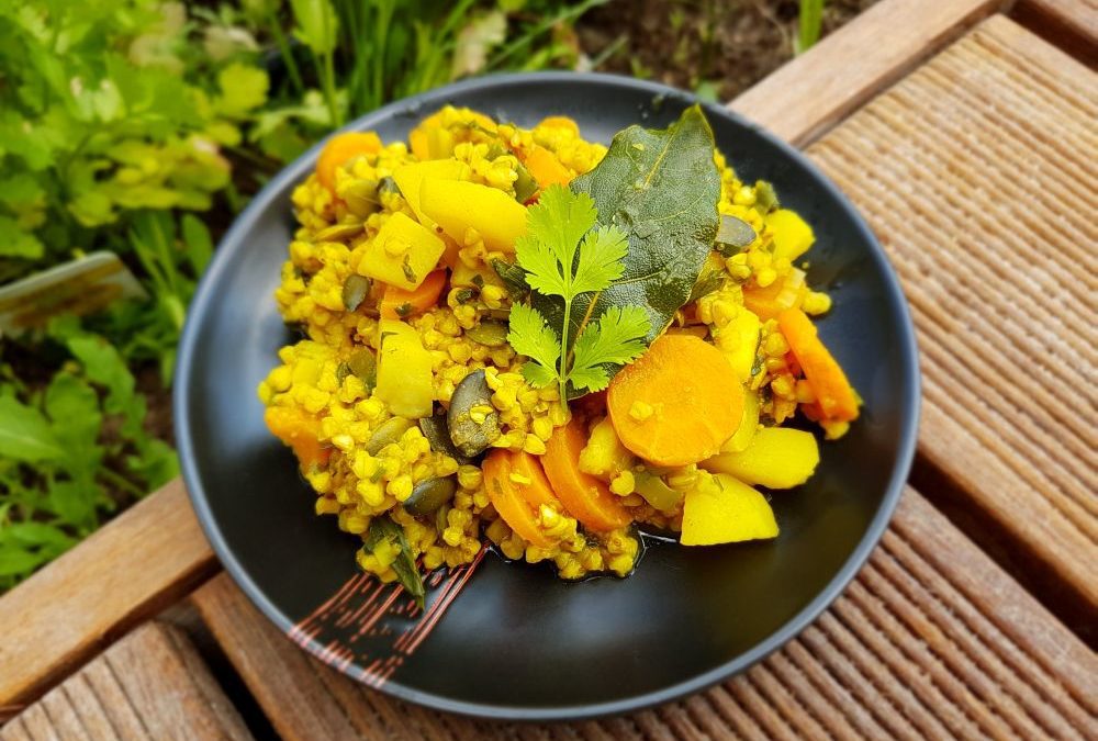 (O) Dodaj kaszę, amarantus i kurkumę. Jeśli potrzeba, możesz dolać gorącej wody. Powinno jej być tyle, żeby przykrywała warzywa