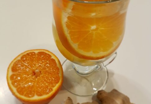 Imbir obierz ze skórki, pokrój w plasterki, wrzuć do kubka. Pomarańczę umyj i krótko sparz wrzątkiem. Ukrój dwa dość grube plastry i wrzuć do kubka. Zalej gorącą wodą, wymieszaj, naciskając łyżeczką na pomarańczę, żeby wycisnąć z niej trochę soku. I pij od razu.
