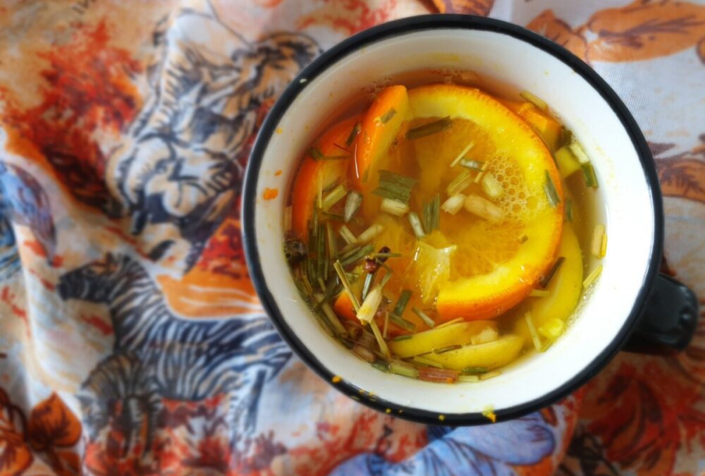 Imbir i kurkumę obierz ze skórki, zetrzyj na tarce na małych oczkach (świetnie nadaje się do tego tarka do sera). Pomarańcze i cytrynę umyj, sparz gorącą wodą, pokrój w cienkie plastry. Umieść wszystkie składniki w dwóch kubkach, zalej gorącą wodą, wymieszaj, ugnieć łyżeczką. Ten sam zestaw można zalewać kilka razy gorącą wodą.