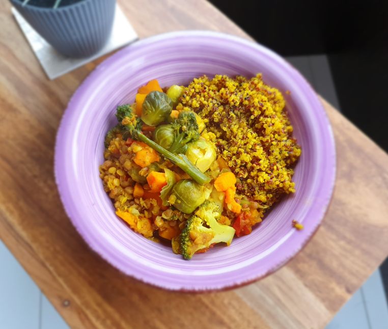 Październikowy gulasz ze słodkich ziemniaków i brukselki