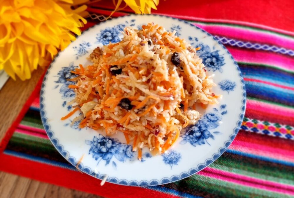 Wymyśliłam ją wczoraj, zrobiłam i okazała się pyszna! Potrzebny będzie kawałek białej kapusty, słodkie, soczyste jabłko, marchewka, czerwona cebula i garść rodzynek. Taka surówka świetnie pasuje do obiadu i może być równie dobrze samodzielnym daniem na lekki lunch albo kolację.