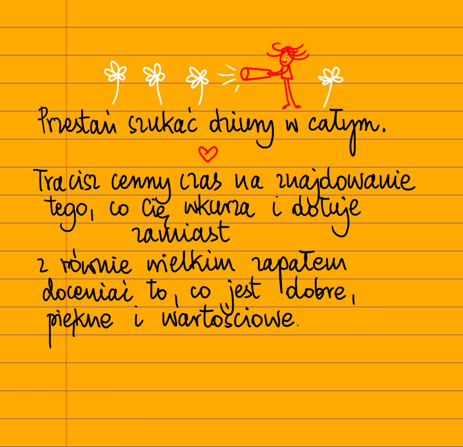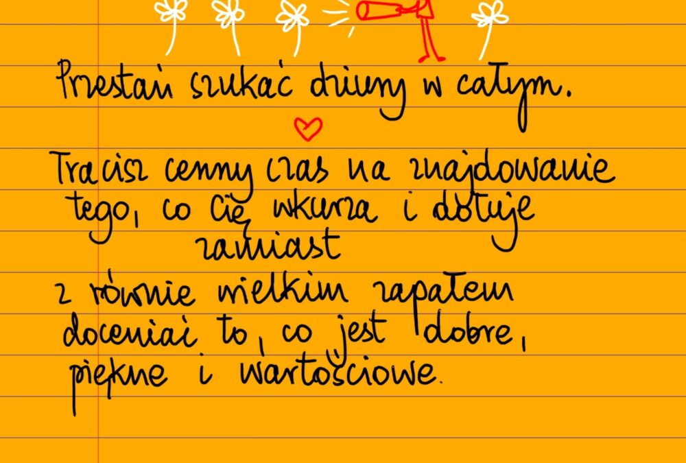 Żółte kartki Przestań szukać dziury w całym piątek, 11.10.2024 Przestań szukać dziury w całym. Tracisz cenny czas na znajdowanie tego, co Cię wkurza i dołuje zamiast z równie wielkim zapałem doceniać to, co jest dobre, piękne i wartościowe ❤ #beatapawlikowska #żółtakartka Udostępnij na Facebooku