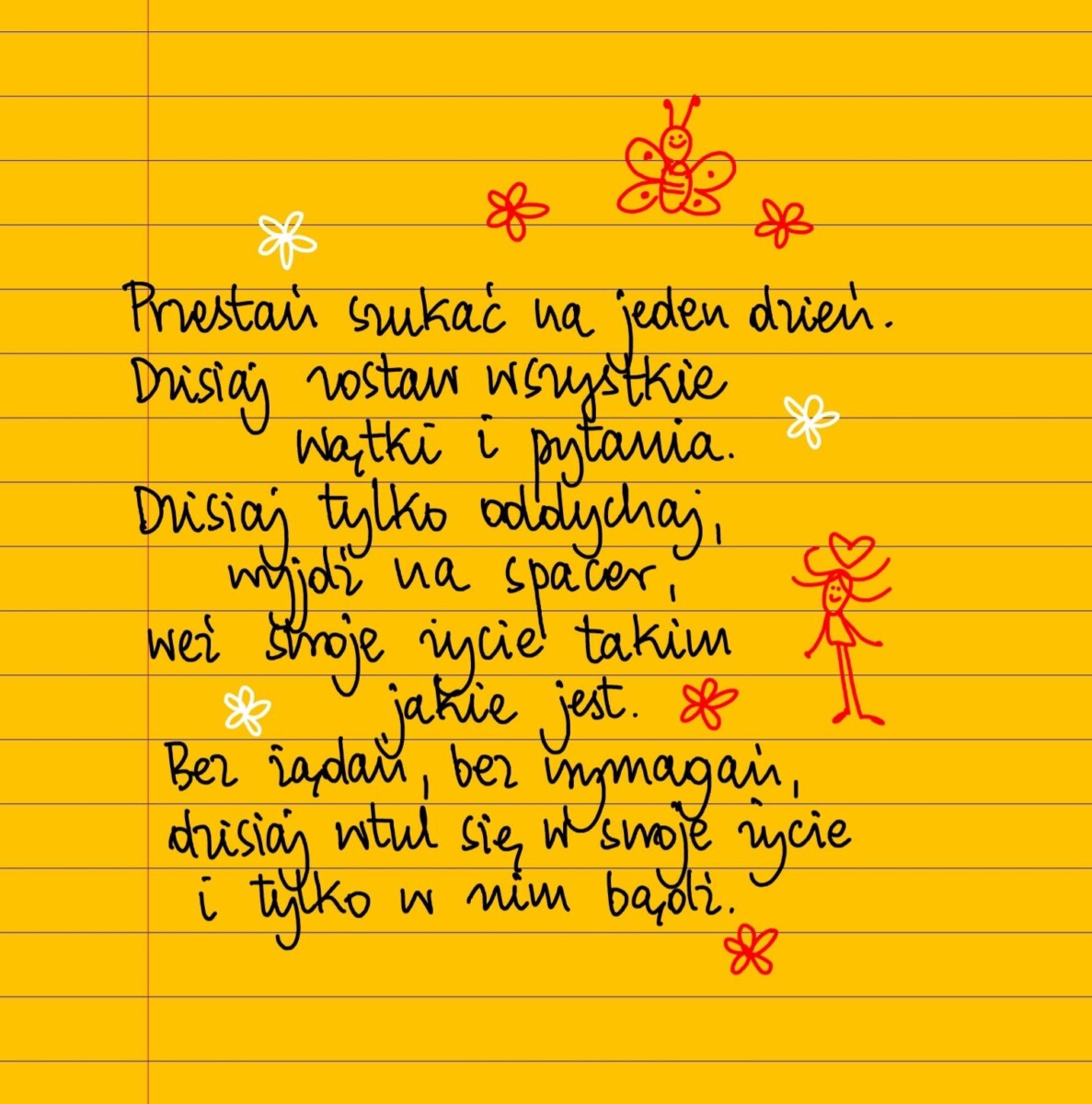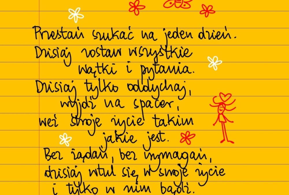 Przestań szukać na jeden dzień. Dzisiaj zostaw wszystkie wątki i pytania. Dzisiaj tylko oddychaj, wyjdź na spacer, weź swoje życie takim jakie jest. Bez żądań, bez wymagań, dzisiaj wtul się w swoje życie i tylko w nim bądź. #żółtakartka